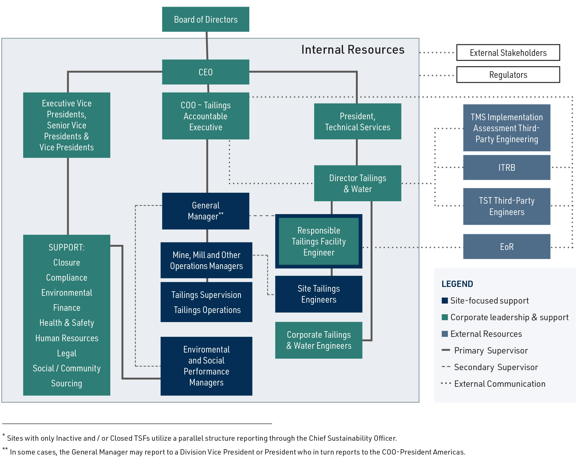 - Board of Directors: Corporate governing body firmly committed to providing active oversight and, with the Corporate Senior Leadership, the necessary financial and technical resources to maintain the safety and integrity of our tailings facilities globally, with a focus on risk management and continuous improvement. The AE regularly reports to the Corporate Responsibility Committee of the Board of Directors on matters related to the tailings management, including implementation of the Tailings Standard.